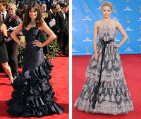 Glee's Lea Michele and Dianna Agron may play high school students on TV, but on the red carpet at Sunday's 2010 Primetime Emmy Awards, it's clear that in real life the two actresses are all grown up--and they've got the glamorous gowns to prove it! Lea looked stunning in a dramatic, ruffled strapless gown and some serious jewelry. Dianna kept it sweet--but no less stunning--in a black and white lace gown with simple accessories.